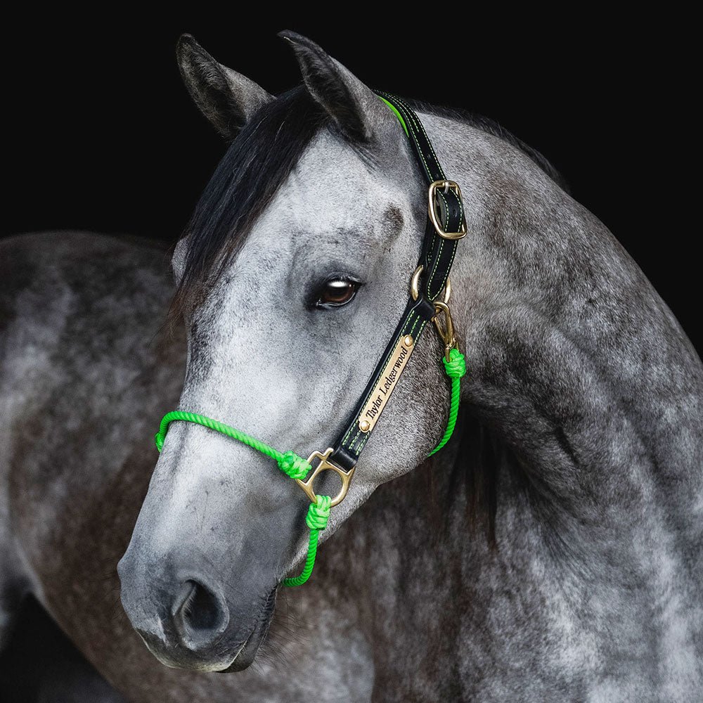 Inspired by the interiors of the world's fastest sports cars, this exclusive halter features rich black leather, lime stitching, a poll padded with supple lime green leather, solid brass hardware, and specially spun LIME green lariat rope. Built for speed, safety and style.