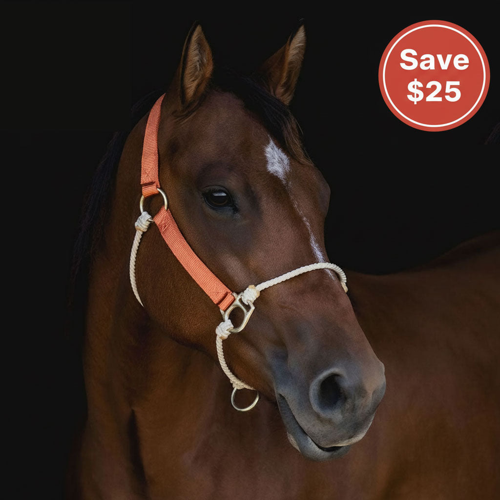 Has a leather breakaway and a stiff lariat nose. Solid brass hardware and vibrantly colored nylon webbing. Popular trainer choice as an "everyday" halter.
